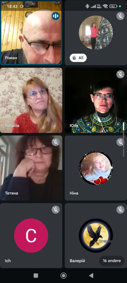 Umso beeindruckender finde ich die Nachrichten der ukrainischen Lyrikgruppe Gesamtukrainische Poetische Familie, der ich auf Facebook folge. Da gab es vergangene Woche eine Einladung zu einem neuen Onlineformat. Teilnehmen konnte man, wenn man dem mitgesandten Link folgte. In dieser Livesendung auf Google Meet werden in nächster Zeit Autoren vorgestellt, die als Soldaten an der Front eingesetzt sind. Die Reihe wurde vergangenen Samstag mit Roman Droniuk (links oben im Screenshot) eröffnet, den Natalia Sidlar-Dubowa aus Charkiw (Bild darunter) interviewte. Der Dichter ließ uns vor allem an seiner Prosa teilhaben, die er voller lebendigem Humor vortrug. Natürlich hatte er auch ernste Gedichte im Programm. Leider hab ich längst nicht alles verstanden, konnte aber an den Reaktionen der anderen Zuschauer mitverfolgen, wie sehr er sein Publikum mit seinen Texten in seinen Bann zog. Während bei den bisherigen Onlinetreffen die Zuschauer sich nur mithilfe der Kommentarfunktion zu Wort melden konnten, war es in dieser Videokonferenz möglich und erwünscht, sich ins Gespräch einzuschalten. Das war offensichtlich nicht nur mir noch ungewohnt (zum ersten Mal auf dieser Plattform fand ich bis zum Schluss der neunzig Minuten währenden Veranstaltung nicht heraus, wie ich das hätte bewerkstelligen können). Auch die meisten Zuschauer verharrten schweigend, ihre Mimik aber sprach Bände. Sogar eine junge Mutter nahm teil. Zwischendurch war zu sehen, wie sie ihren Säugling fütterte. Bei einer anderen Teilnehmerin war der kleine Junge im Hintergrund zu erkennen, der die Veranstaltung offensichtlich aufmerksam verfolgte. Natalia Sidlar-Dubowa ermunterte das Publikum mehrfach dazu, seine Fragen loszuwerden. Gegen Ende dankten viele mit überschwänglichen Worten für das warmherzige Treffen, das ihnen geholfen hatte, auf andere Gedanken zu kommen.